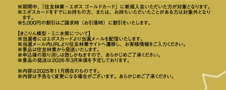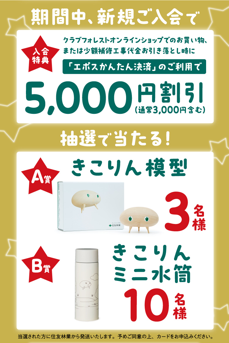 クラブフォレスト オンラインショップでお買い物の際、お支払い方法選択時に「エポスかんたん決済」をご選択いただくか、または住友林業ホームテックの少額補修工事代金を「エポスかんたん決済」でお支払いいただくと、ご請求時にカードご利用金額から3,000円を上限に自動的に割引いたします。