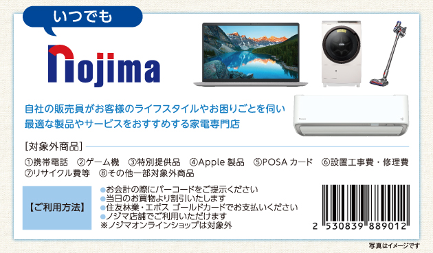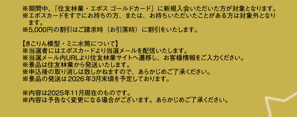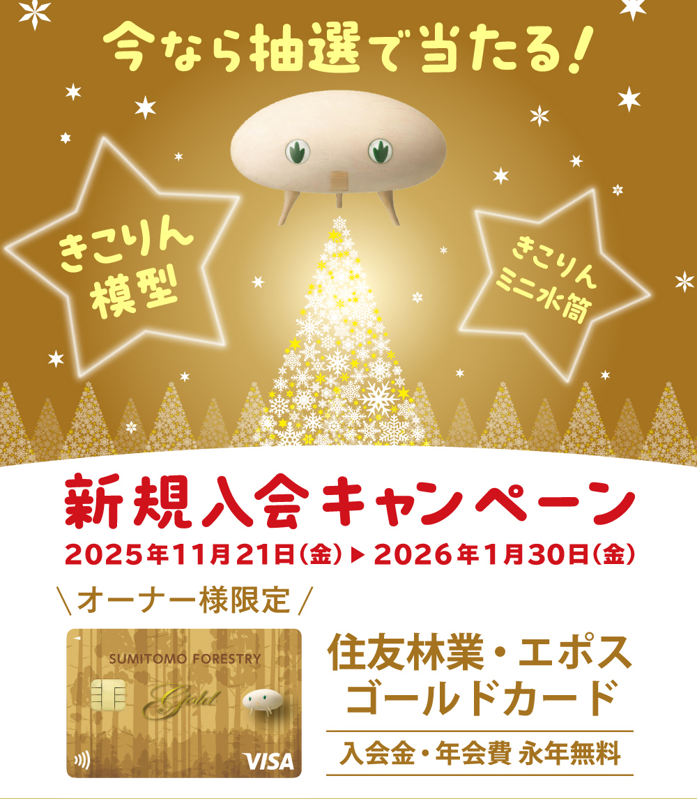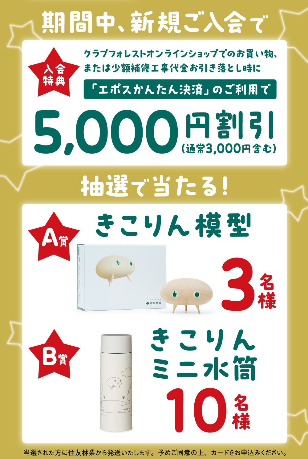 クラブフォレスト オンラインショップでお買い物の際、お支払い方法選択時に「エポスかんたん決済」をご選択いただくか、または住友林業ホームテックの少額補修工事代金を「エポスかんたん決済」でお支払いいただくと、ご請求時にカードご利用金額から3,000円を上限に自動的に割引いたします。