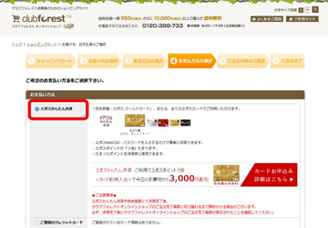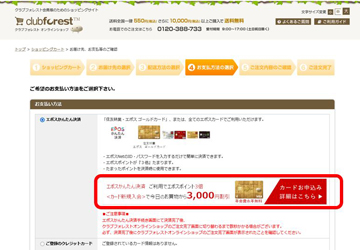 「クラブフォレスト オンラインショップ」でお申し込み当日にエポスかんたん決済をご利用いただく場合は、「クラブフォレスト オンラインショップ」の「お支払い方法選択画面」よりお申し込みください。