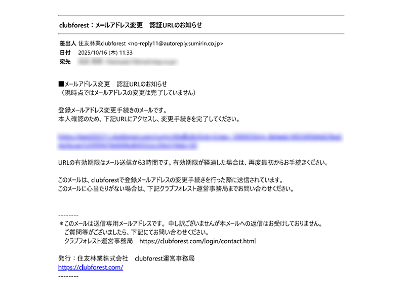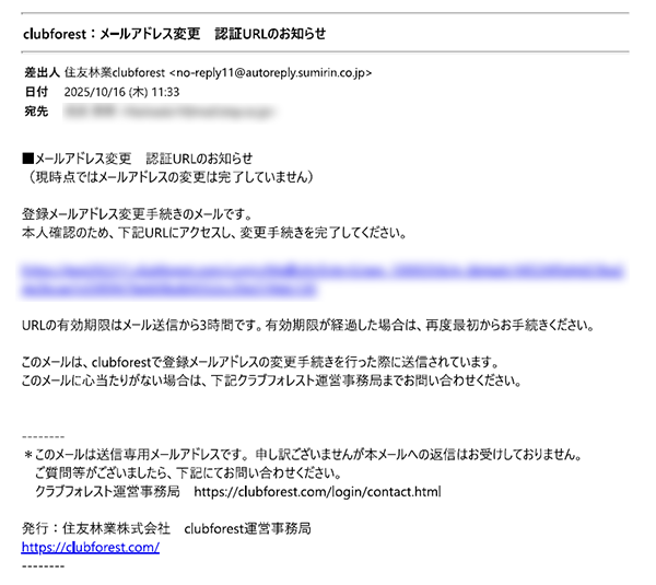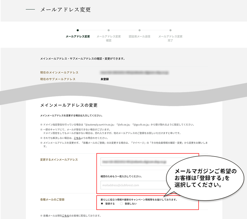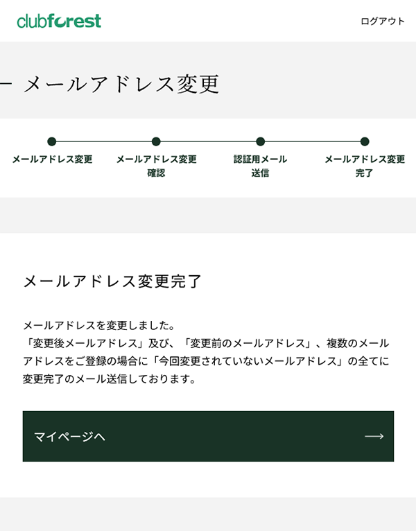 クラブフォレストへのログイン後、「マイページ 」→「メールアドレス変更」→「パスワード再認証」と進むと、