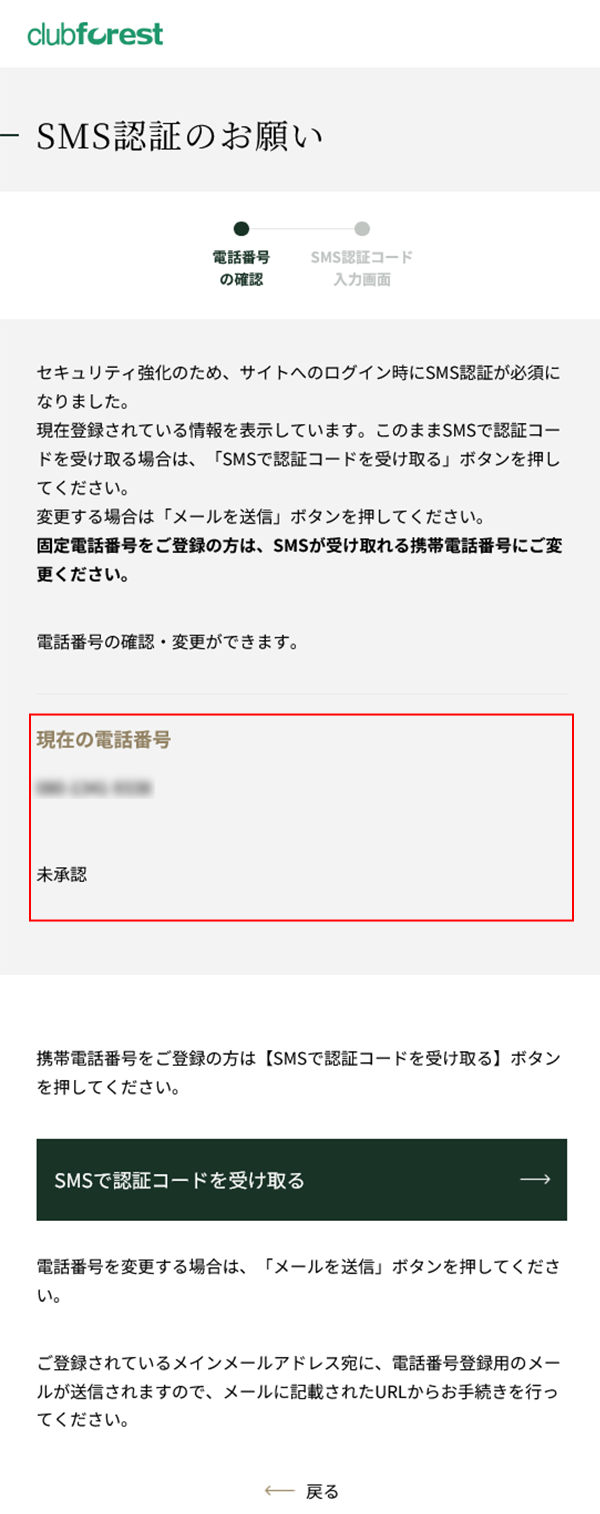 ●ご登録いただいている電話番号は「SMS認証のお願い」の画面より、変更が可能です。